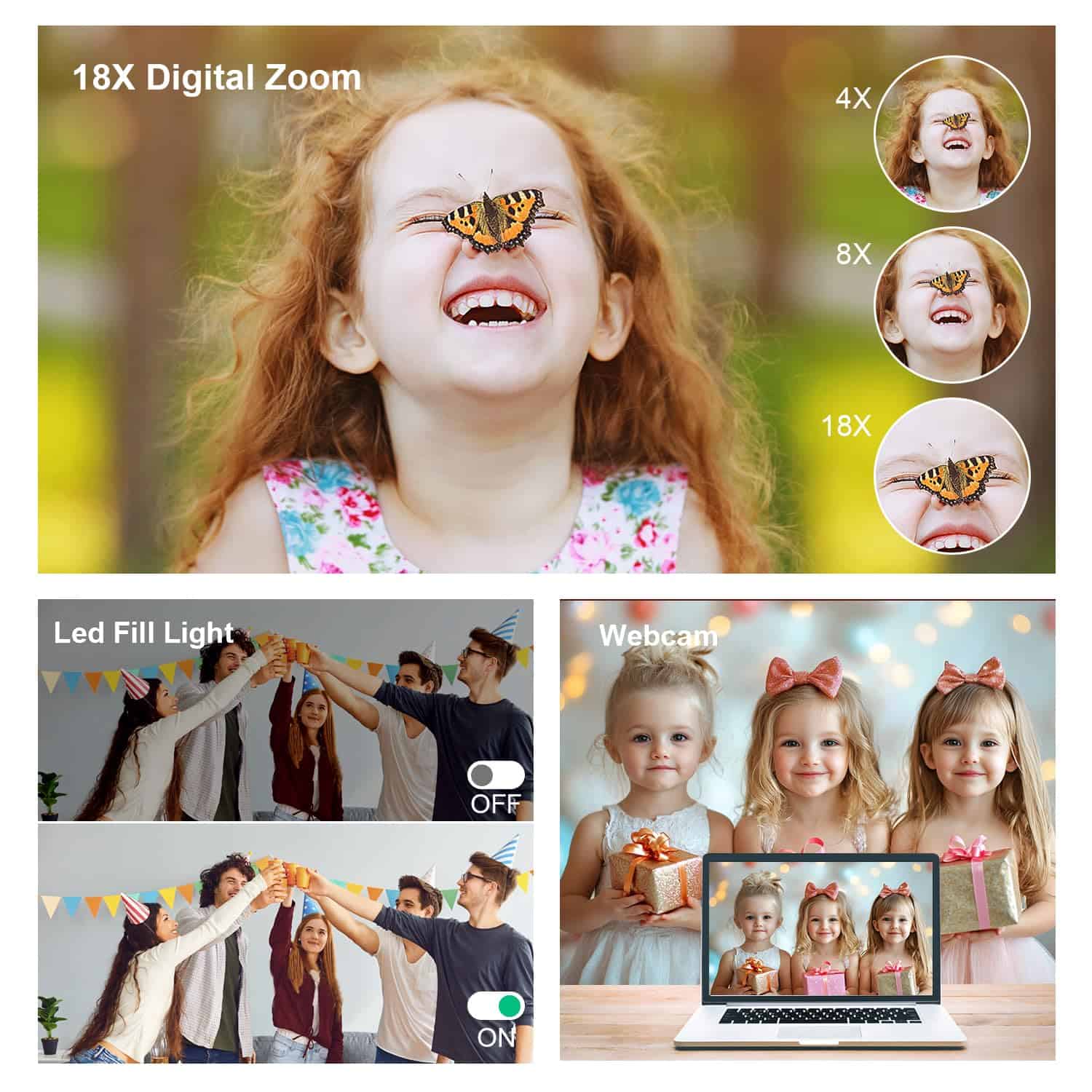 La Cámara Digital WLYSZCN cuenta con una resolución Full HD 1080P y 44MP que te permite capturar videos y fotos de alta calidad. La función de antivibración mejora la experiencia de disparo para principiantes y niños. Además, el zoom digital 16X te permite acercar la imagen sin perder calidad. Con su pantalla LCD de 2.4″, esta cámara es fácil de usar para niños y principiantes. Viene con una batería recargable y una tarjeta de memoria SD de 32GB gratuita. Perfecta para fiestas, viajes y regalos de Navidad o cumpleaños.