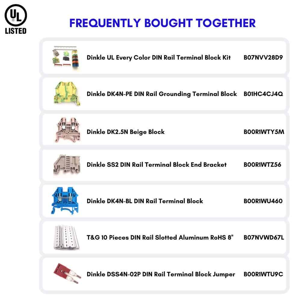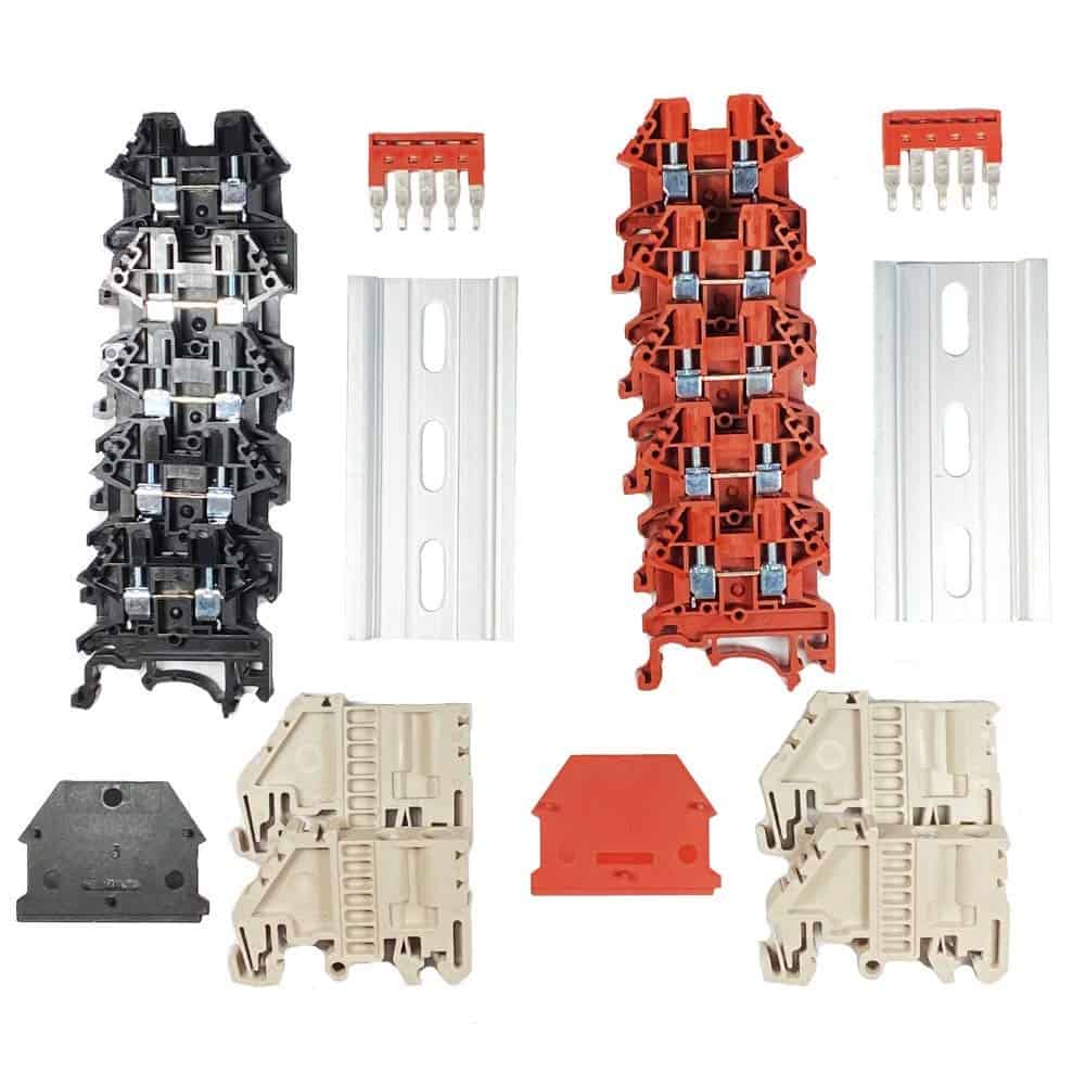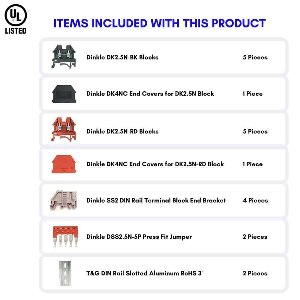 Datos Técnicos (UL) Voltaje Nominal: 600V Corriente Nominal: 20A Sección Transversal del Conductor, Sólido (AWG): 22-12 Sección Transversal del Conductor, Flexible (AWG): 22-12 Voltaje Nominal de Impulso: 6KV Torsión (N-m): 0.4 Tornillo: M2.5 Longitud de Pelar el Cable: 9-11mm Material Aislante: PA TxHxW (mm): 5.1 x 39.6 x 40.5 (Bloques Individuales) Riel DIN (mm): 35, 32 Puente: Presión/Inserción. Estas dos unidades incluyen 5 bloques terminales DK2.5N-BK y 5 DK2.5N-RD de Dinkle, 2 saltadores DSS2.5N-05P, 4 soportes de extremo SS2, 1 cubierta de extremo DK4NC-RD y 1 DK4NC-BK, cada uno montado en un riel de aluminio de 3″. Los 5 bloques negros están conectados en común y los 5 bloques rojos están conectados en común. Cada unidad está etiquetada del 1 al 10 con etiquetas de marcado TM26W.