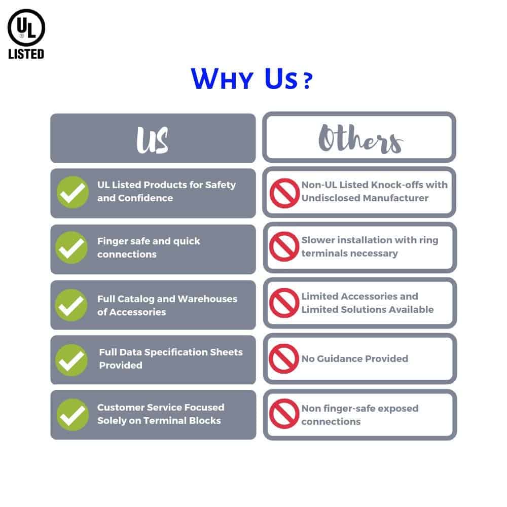 1. Barra de Bus Seguro para los Dedos. 2. No se necesitan Terminales Anillo para una Instalación Rápida. 3. Elevador de Jaula. 4. Base de Montaje de Aluminio en Riel DIN. 5. Cada Barra de Bus Maneja Hasta 20 Amperios en Total