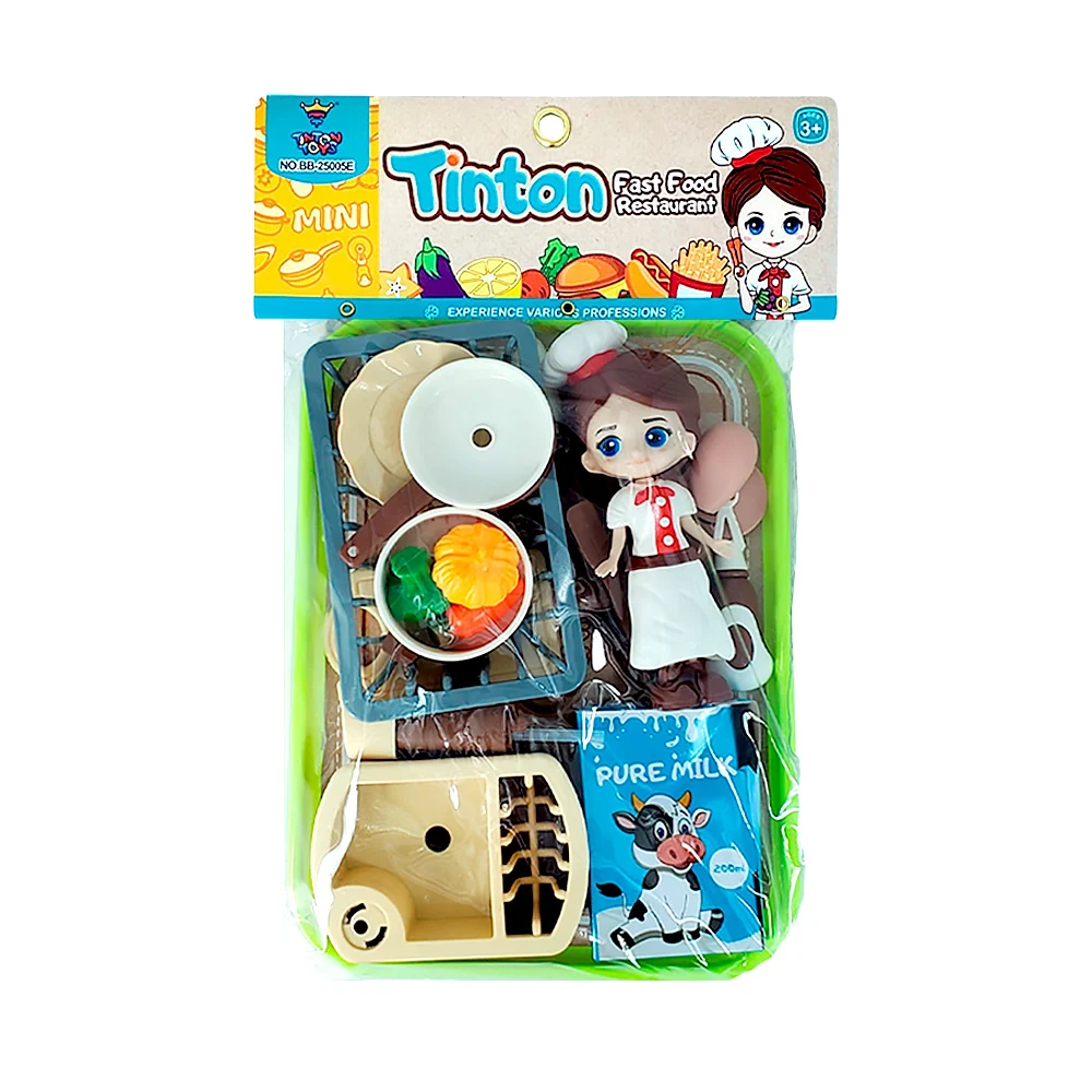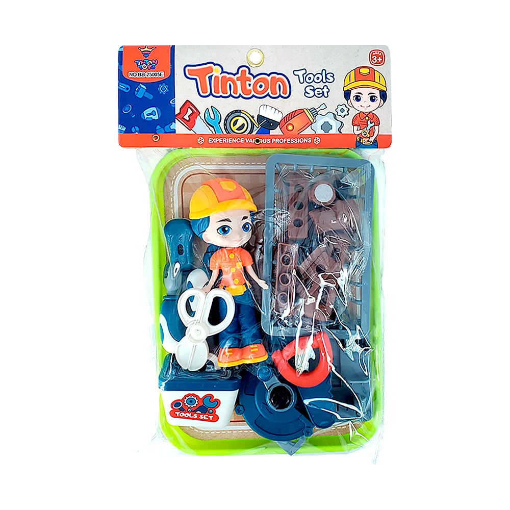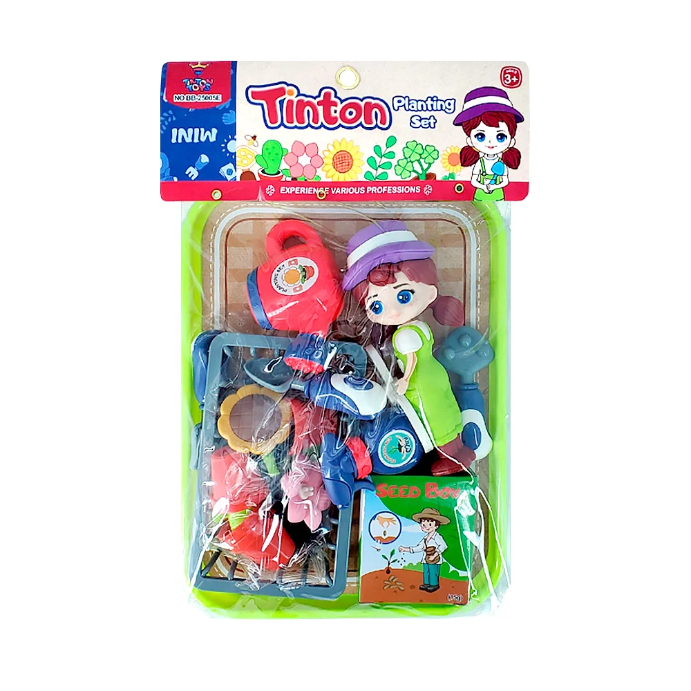 Set de muñeca Tinton con base rectangular y accesorios, diseñado para fomentar el juego imaginativo en los niños. Este set incluye una muñeca con temática de jardinera, perfecta para que los pequeños exploren el mundo de la jardinería.