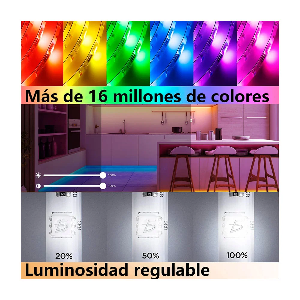 Transforme cualquier ambiente de su hogar con esta tira de luces LED RGB de última generación, diseñada para ofrecer una iluminación personalizada y envolvente. Gracias a su conectividad inteligente, podrá controlar una gama infinita de colores y efectos dinámicos directamente desde su dispositivo móvil, permitiendo que la luz se sincronice con su música favorita o se adapte al estado de ánimo de cada habitación, desde salas de estar hasta dormitorios y cocinas.