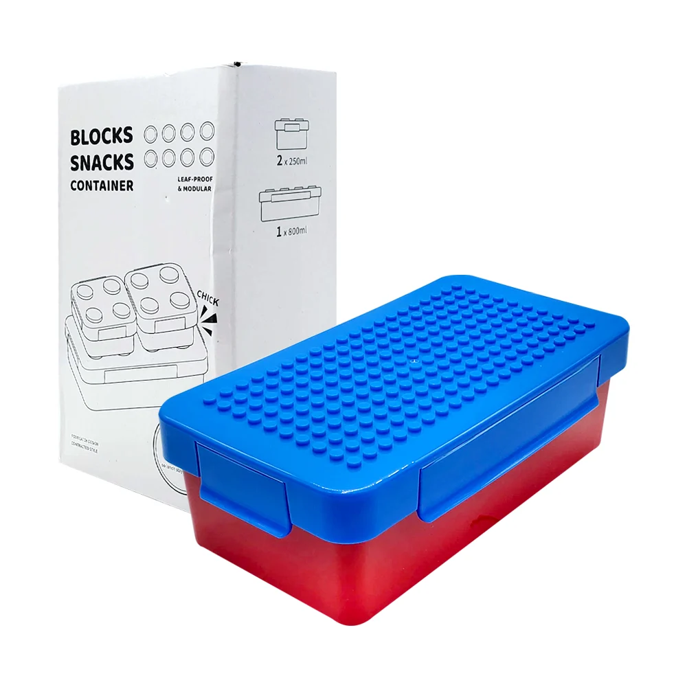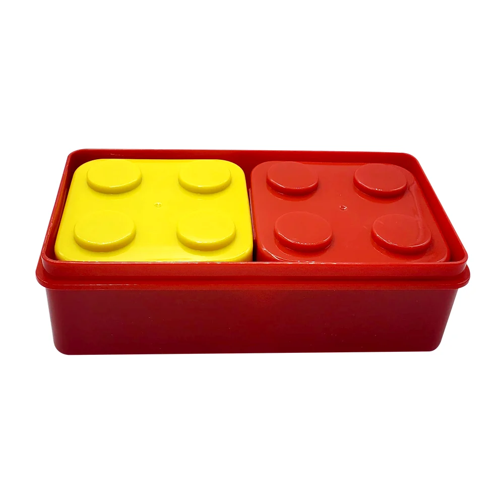 Tupper rectangular de 2 niveles en forma bloque de construcción con divisor y 2 tupper pequeños